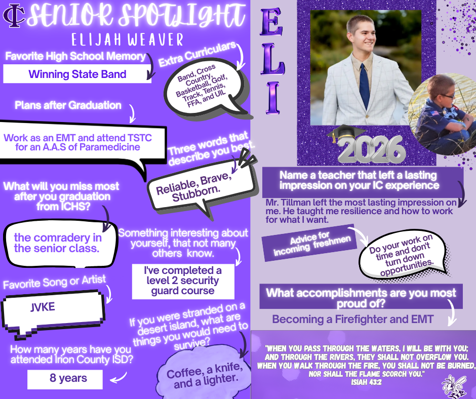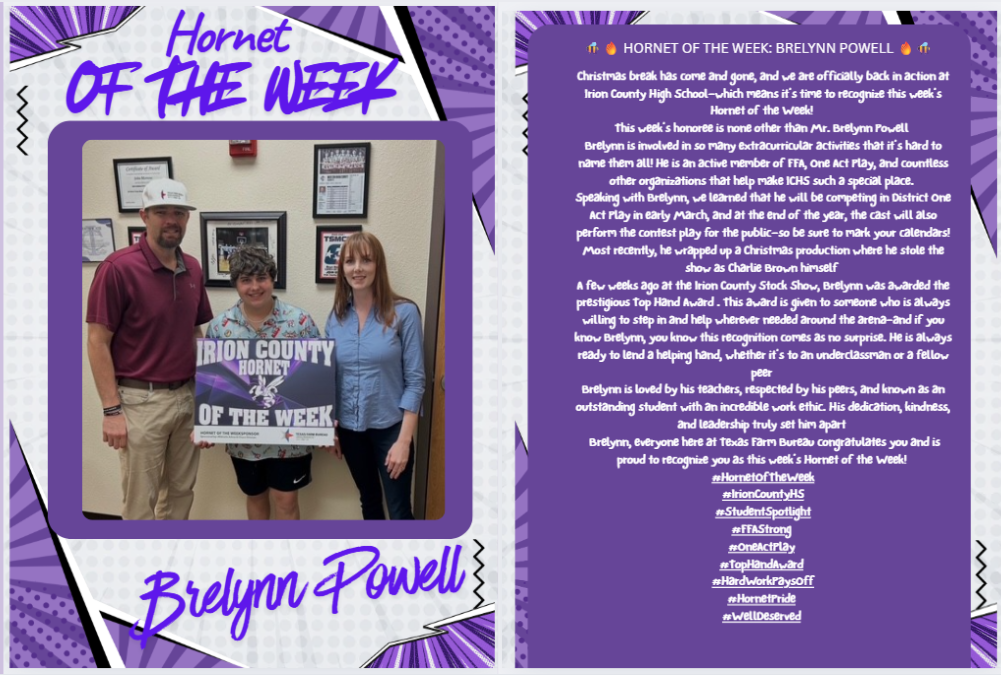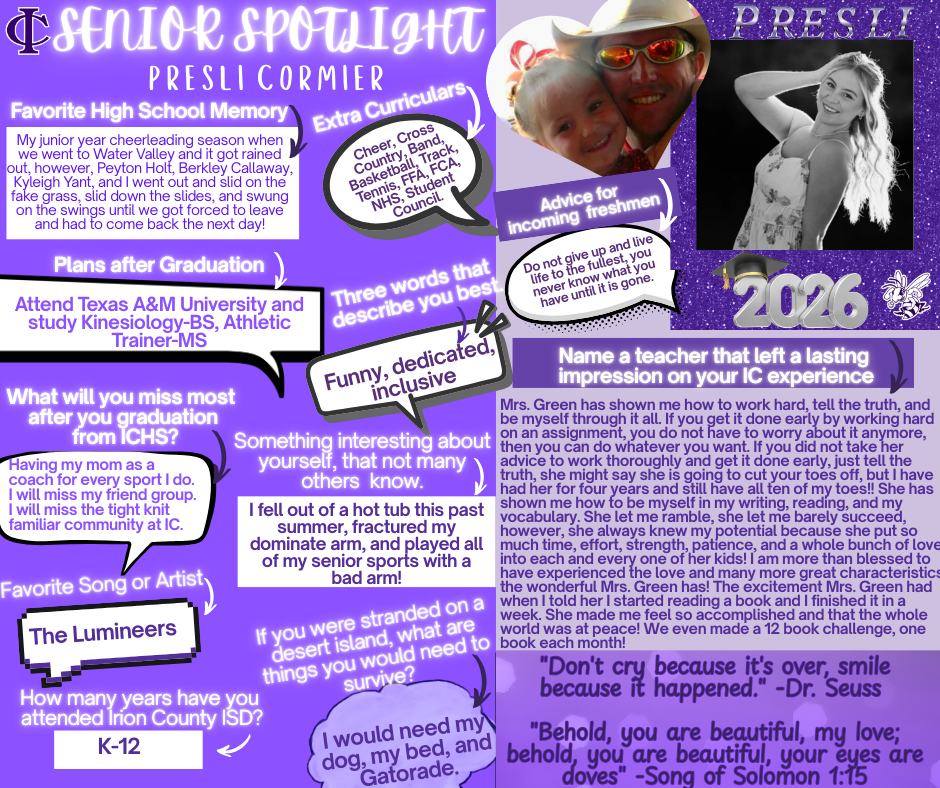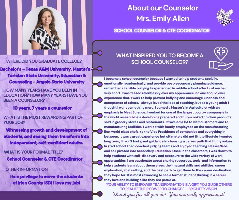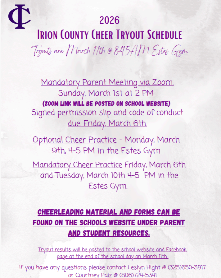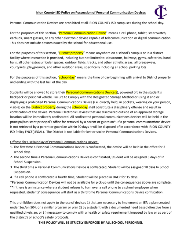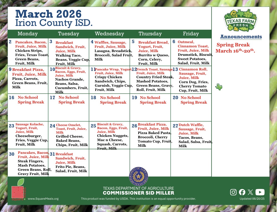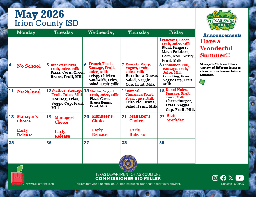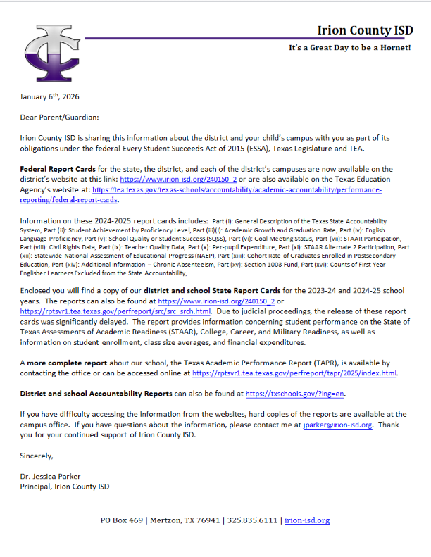 Irion County ISD shall ensure a safe, positive environment that provides real world preparation to develop critical thinkers that possess a diverse range of qualities and abilities that enable them to succeed in all ways of life.